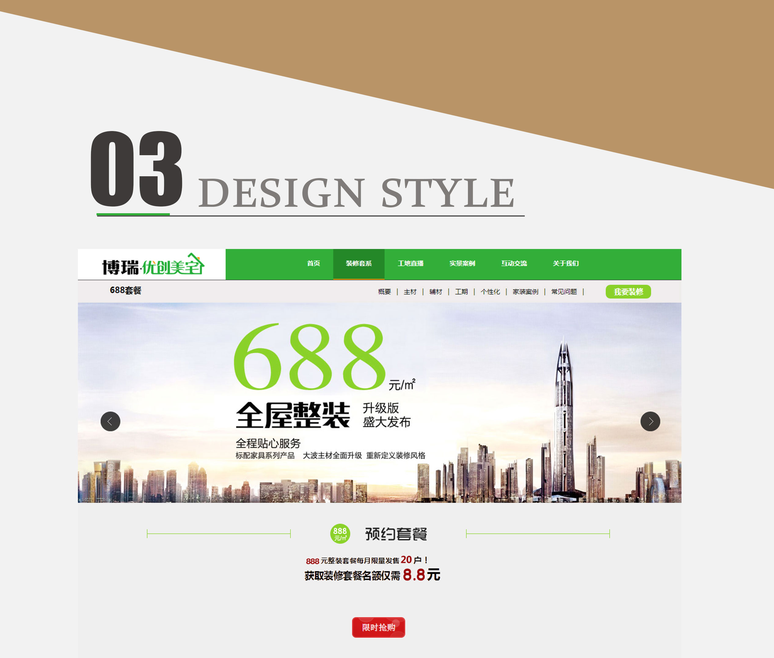 互联网家装行业网站,提供套餐展示、在线订购、网上商城功能,年轻一代家装的不二选择。