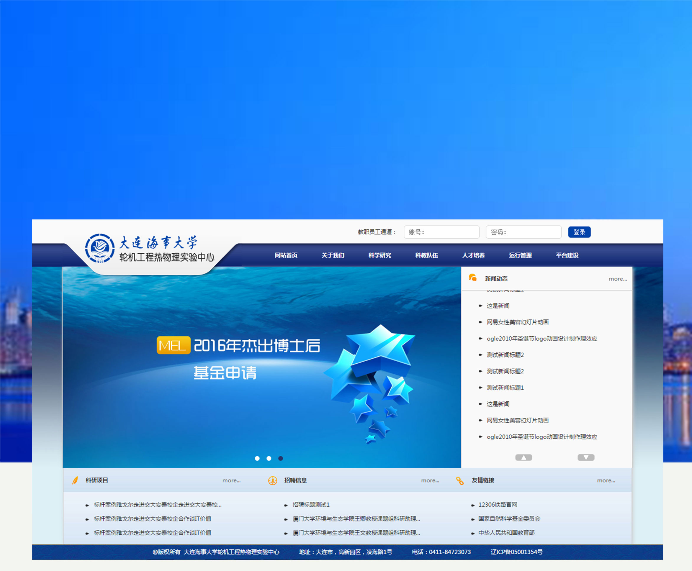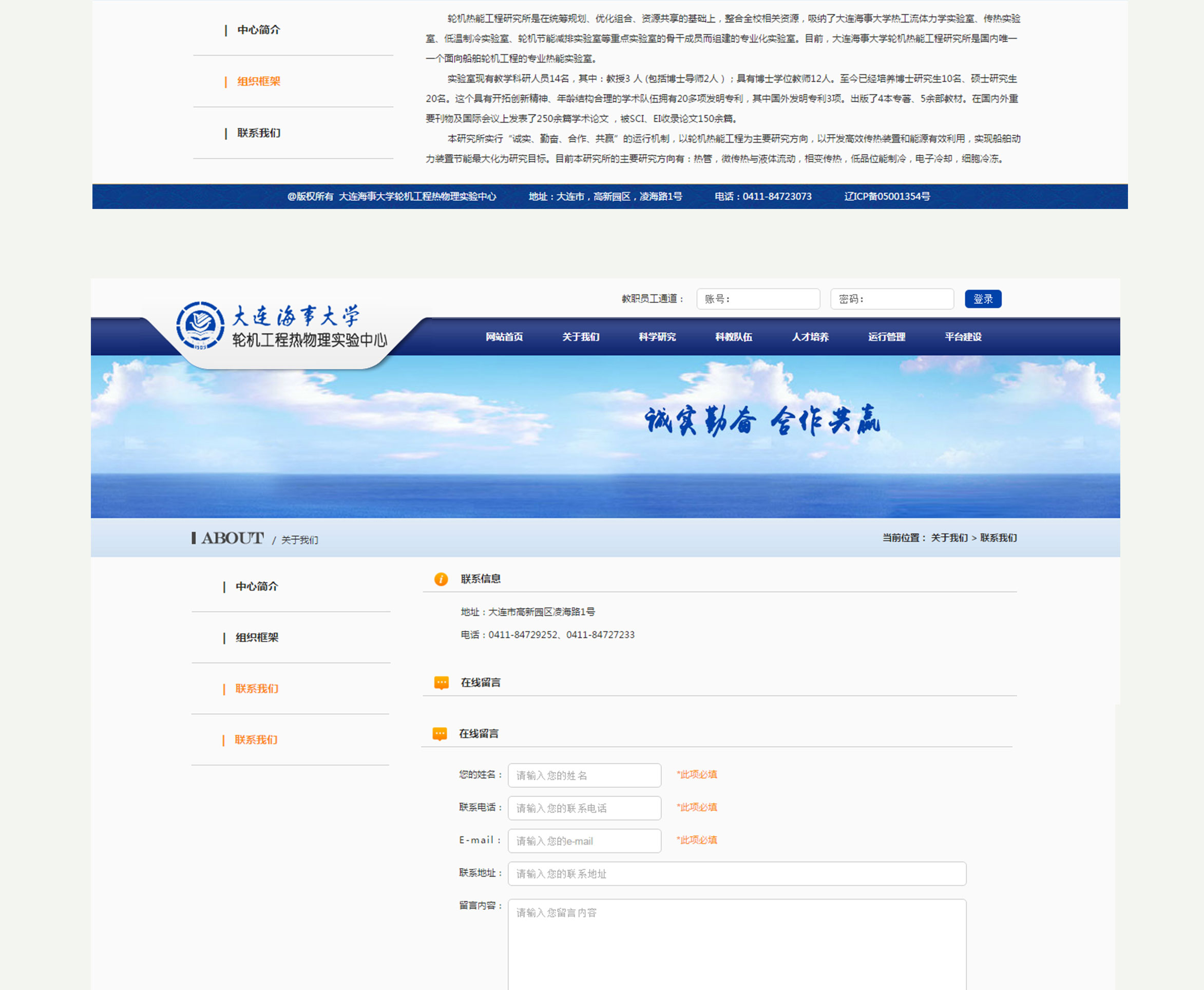 大连海事轮机工程热物理实验中心网站:展示新闻、研究项目、组织框架、科学研究内容、科教队伍等模块,设有教职员工登录通道,对个人信息加以维护。网站采用蓝色系主色调,突出海事相关研究特点。