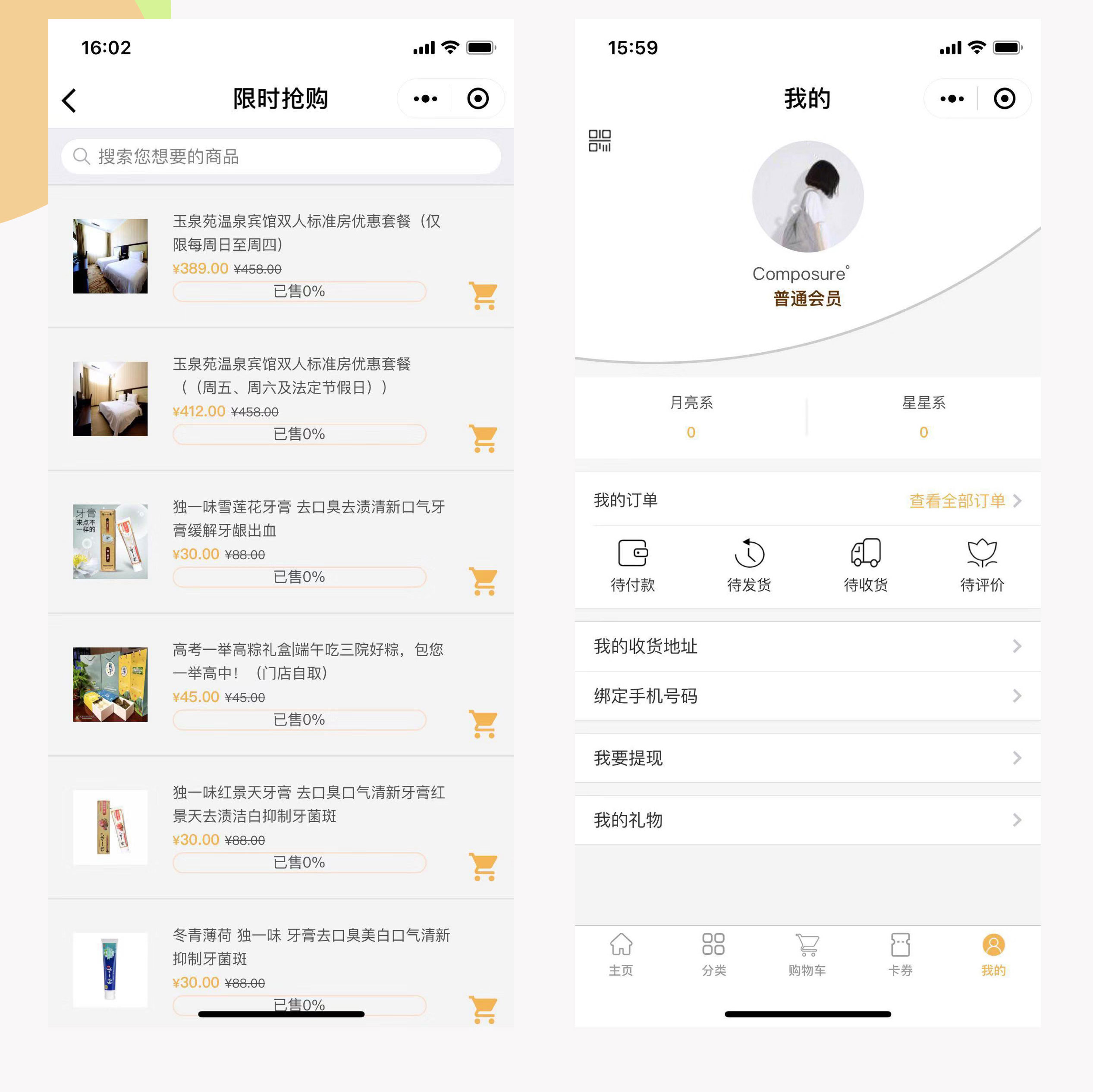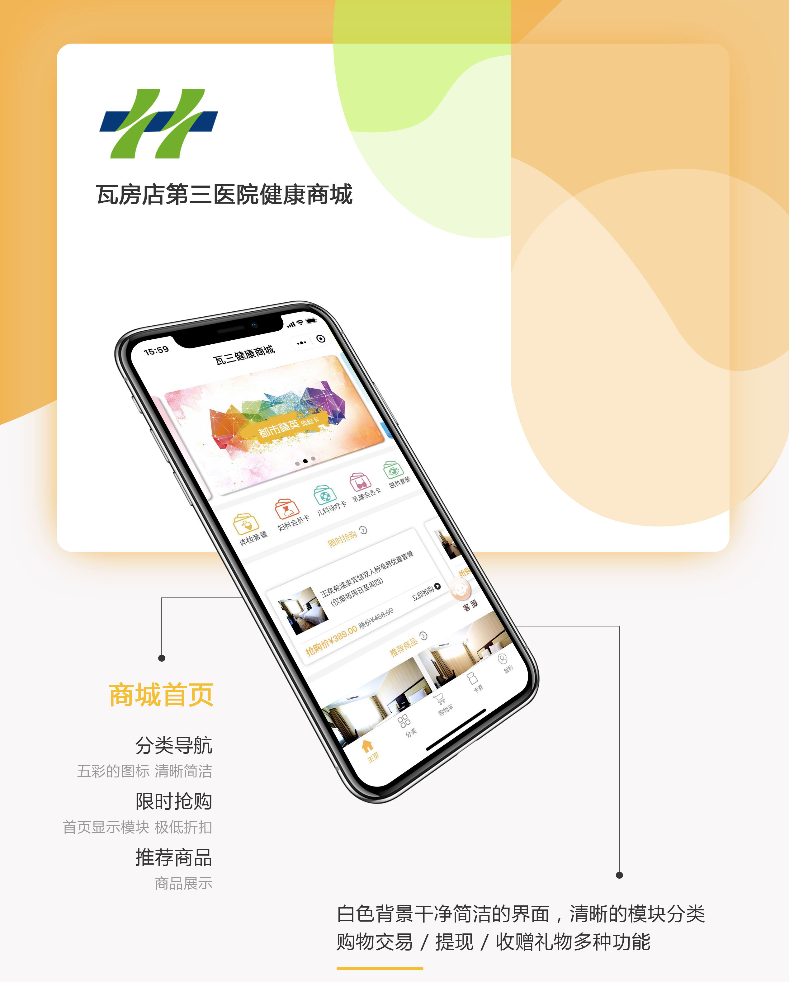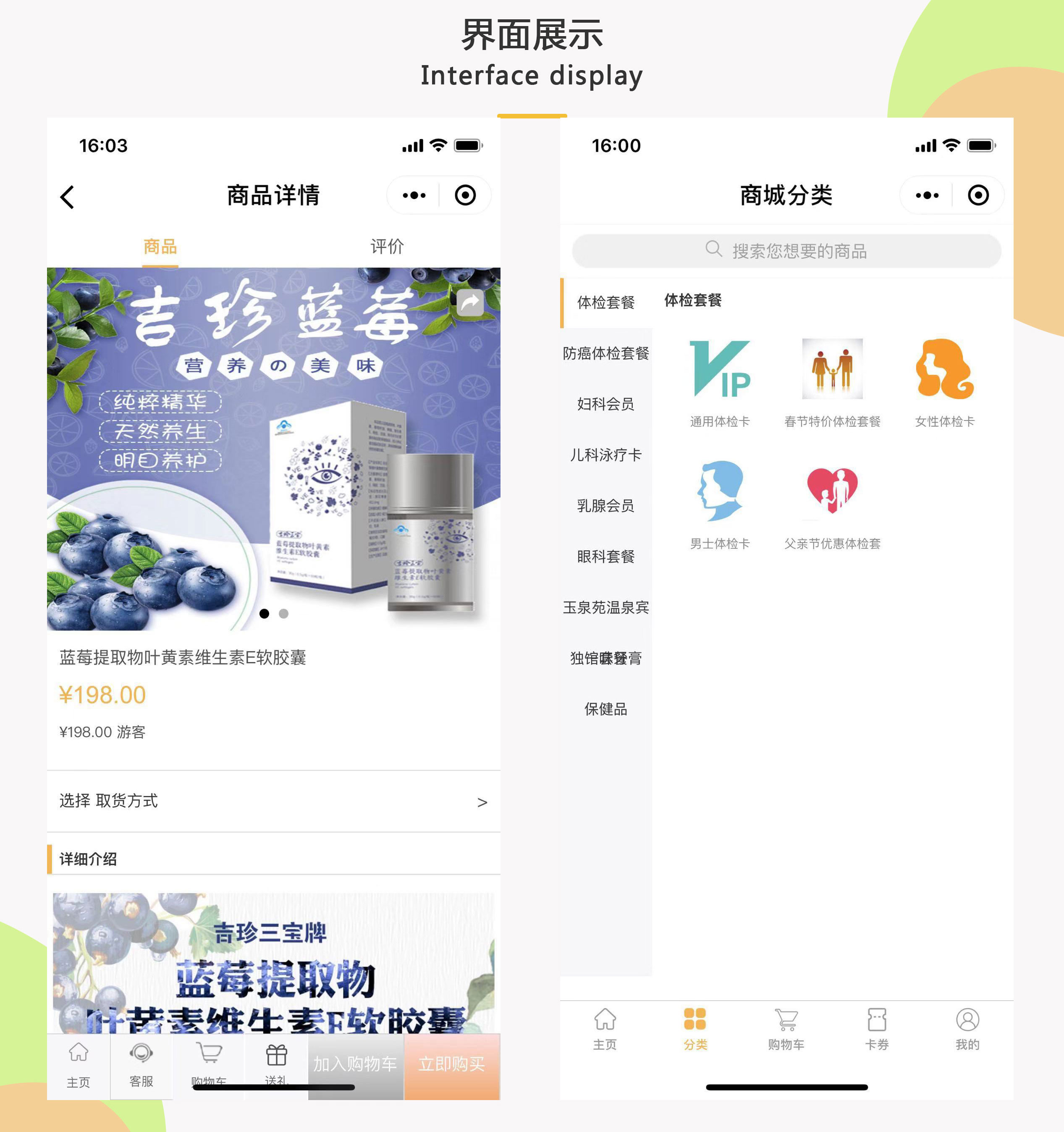 设计理念:健康商城小程序,采用橘色为主色调,模块分类样式多种,活泼并突出内容。