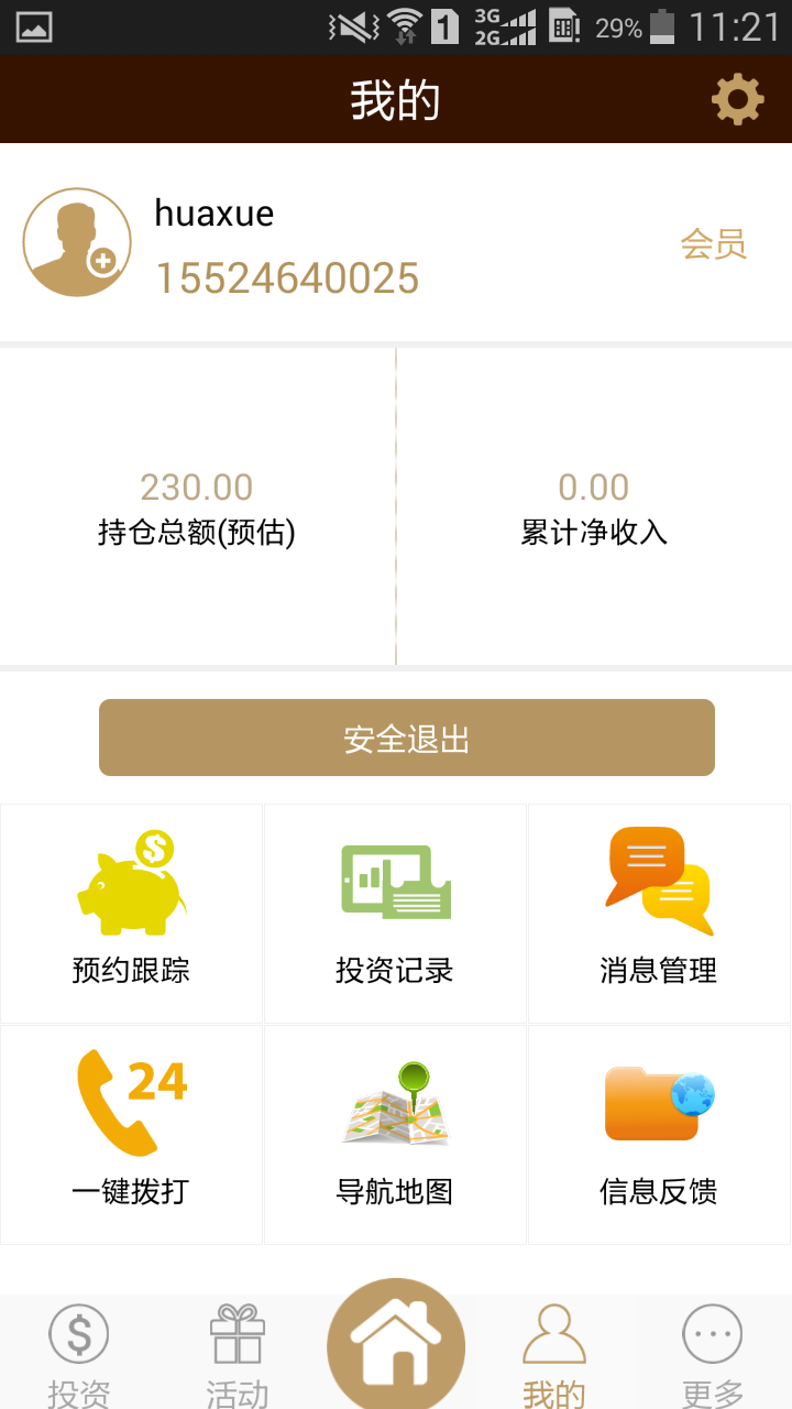 3. 我的:查询用户当下账户余额、收益、投资记录等相关信息。点击右上角控件,可修注册信息和登录密码,如下图“设置”