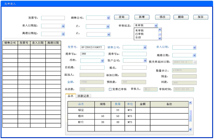 1、功能:查询、修改、审核发票信息、保存