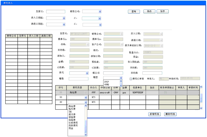 1、功能:查询、修改、审核费用信息、保存